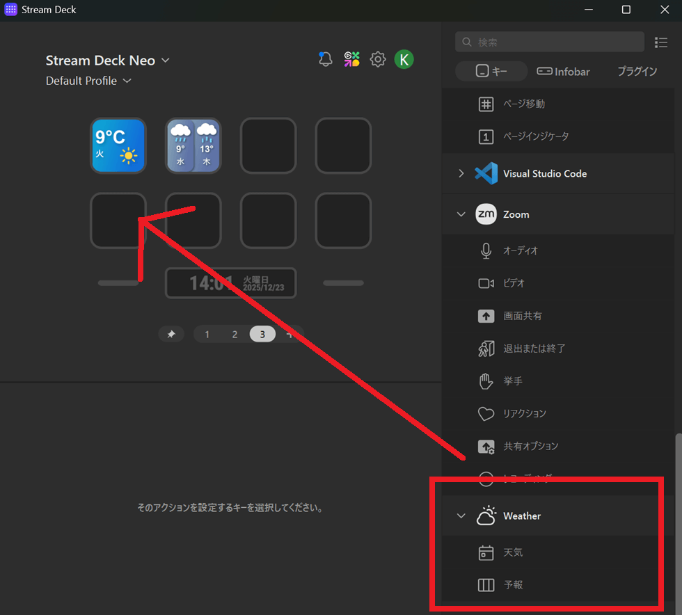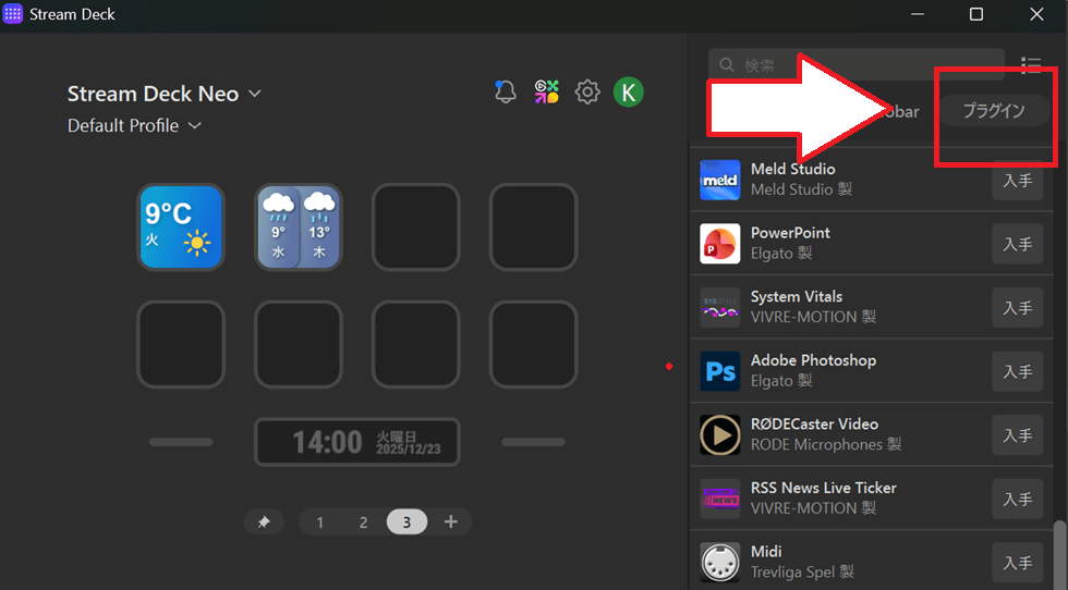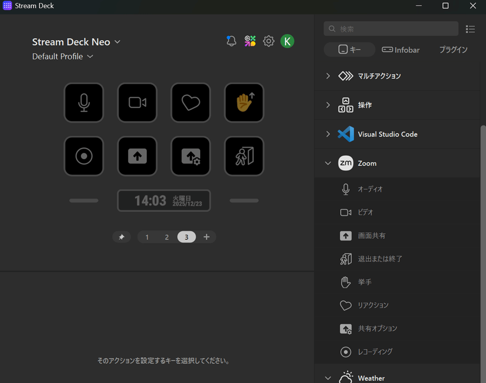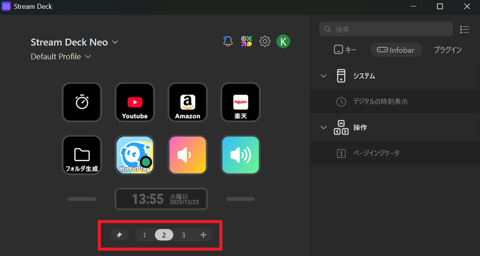 「Stream Deck NEO」などページ切り替え出来るモデルの場合は、本体からこ1ページ、2ページ、3ページと切り替えができます。